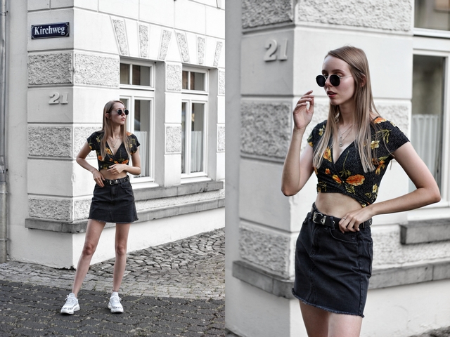 Zwarte wrap top met bloemenprint: Primark | Zwarte spijkerrok: America Today via de Bijenkorf* | Zonnebril op sterkte: Polette* | Zilveren sieraden: Lucardi*, My Jewellery* en Zilver & Zoet* | Zwarte riem: AliExpress | Witte Bubbly Dalmatian sneakers: Bronx via Omoda*